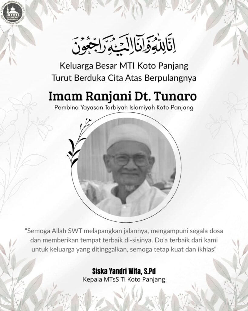 Koto Panjang — Keluarga besar Yayasan Tarbiyah Islamiyah Koto Panjang menyampaikan duka cita yang sangat mendalam atas wafatnya Pembina Yayasan, Bapak Imam Ranjani Dt. Tunaro, pada Rabu, 10 Desember 2025, sekitar pukul 13.00 WIB. Beliau berpulang ke rahmatullah dalam usia 86 tahun.