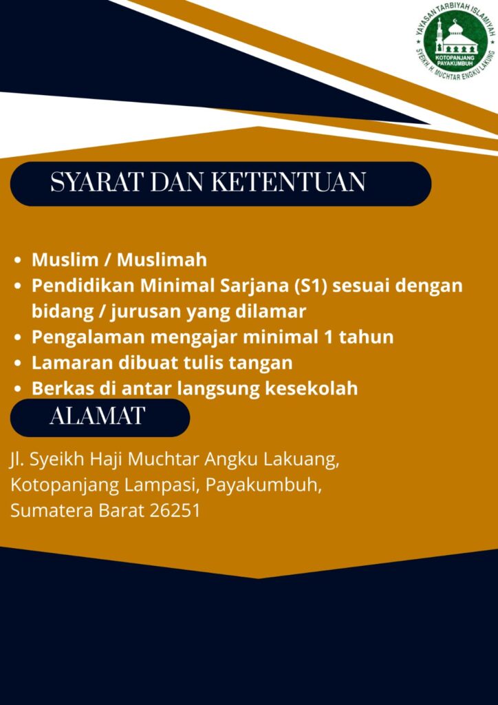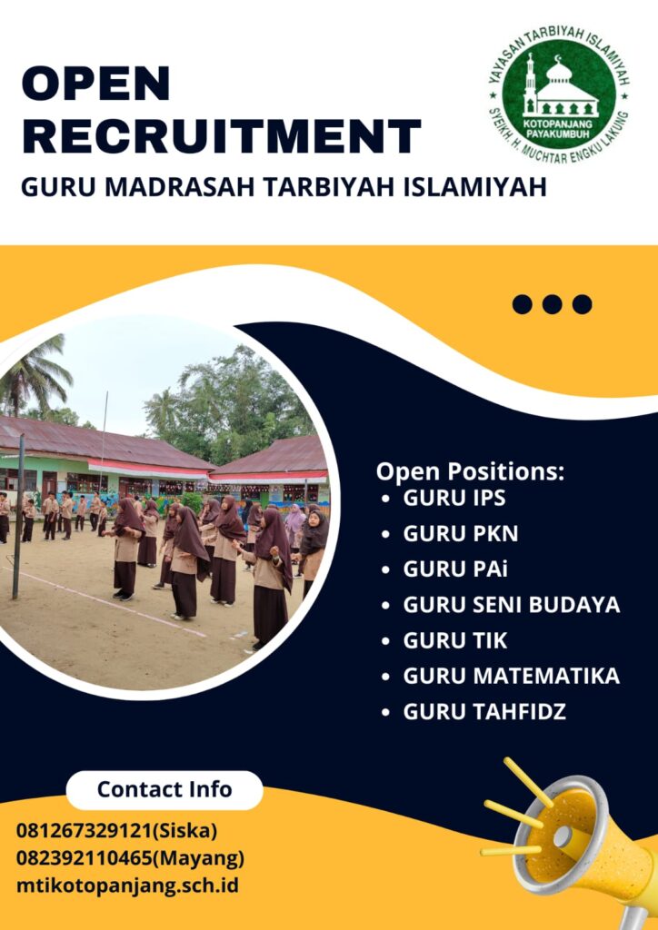 Madrasah Tarbiyah Islamiyah (MTI) Koto Panjang membuka kesempatan bagi para pendidik terbaik untuk bergabung dan berkhidmat dalam dunia pendidikan Islam.