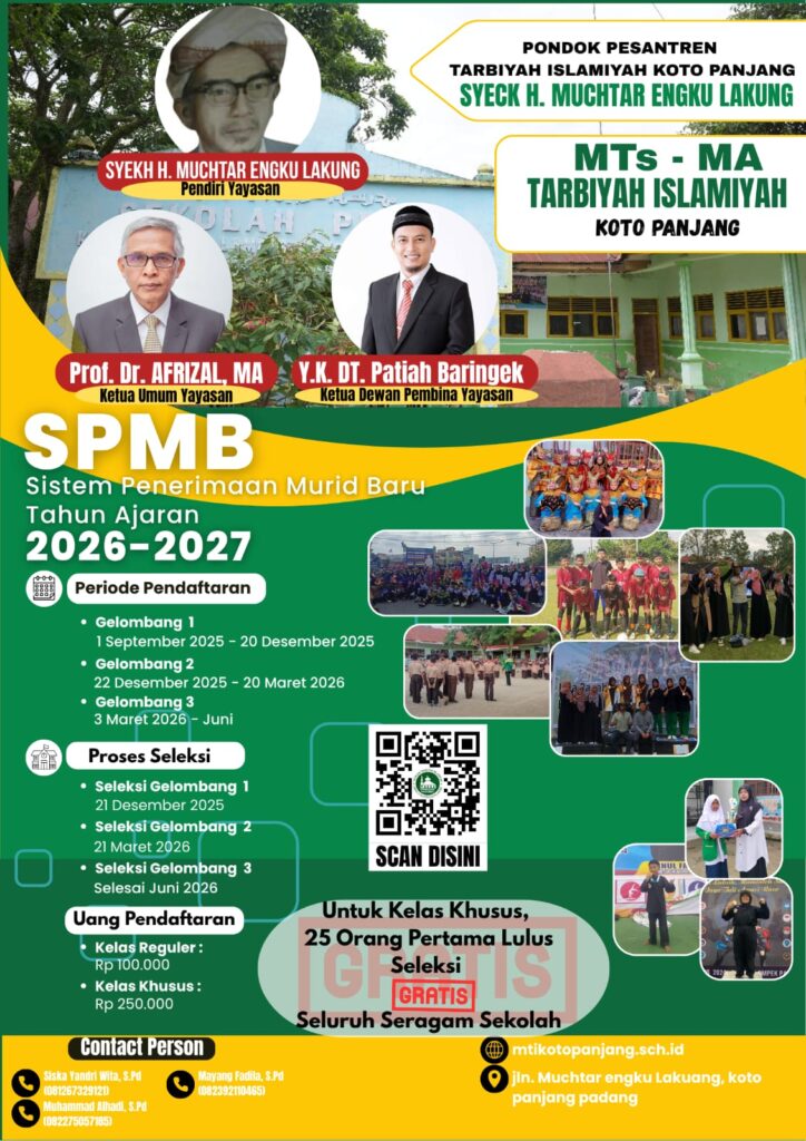 Pondok Pesantren Tarbiyah Islamiyah Koto Panjang membuka kesempatan bagi putra-putri terbaik untuk bergabung bersama kami dalam Sistem Penerimaan Murid Baru (SPMB) Tahun Ajaran 2026–2027. Dengan semangat pendidikan yang berlandaskan nilai-nilai Islam dan tradisi keilmuan pesantren, kami berkomitmen mencetak generasi Qur’ani yang unggul, berakhlak mulia, dan siap menghadapi tantangan zaman.