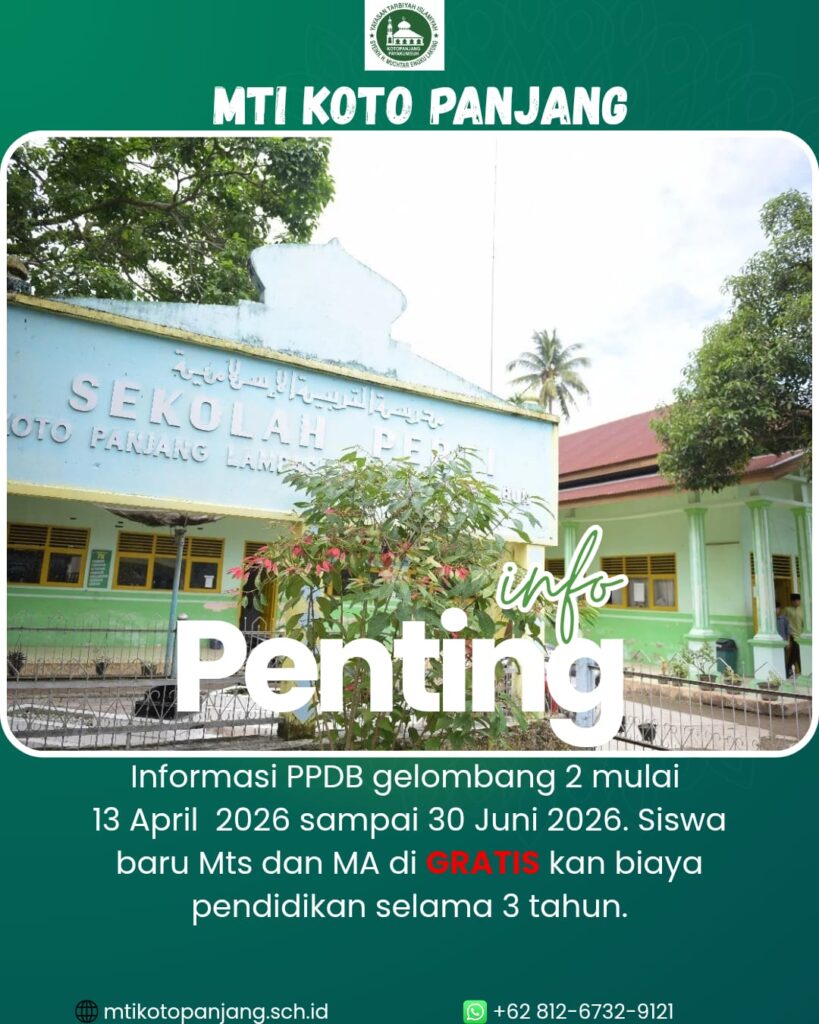 MTI Koto Panjang kembali membuka kesempatan emas bagi para calon peserta didik baru tingkat MTs dan MA melalui program unggulan berupa gratis biaya pendidikan selama 3 tahun. Program ini diberikan sebagai bentuk komitmen lembaga dalam mendukung akses pendidikan yang berkualitas, terjangkau, dan berlandaskan nilai-nilai keislaman.